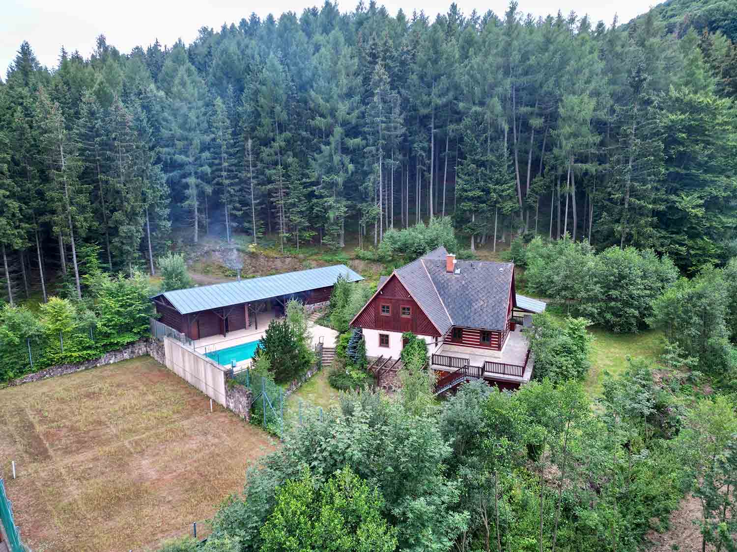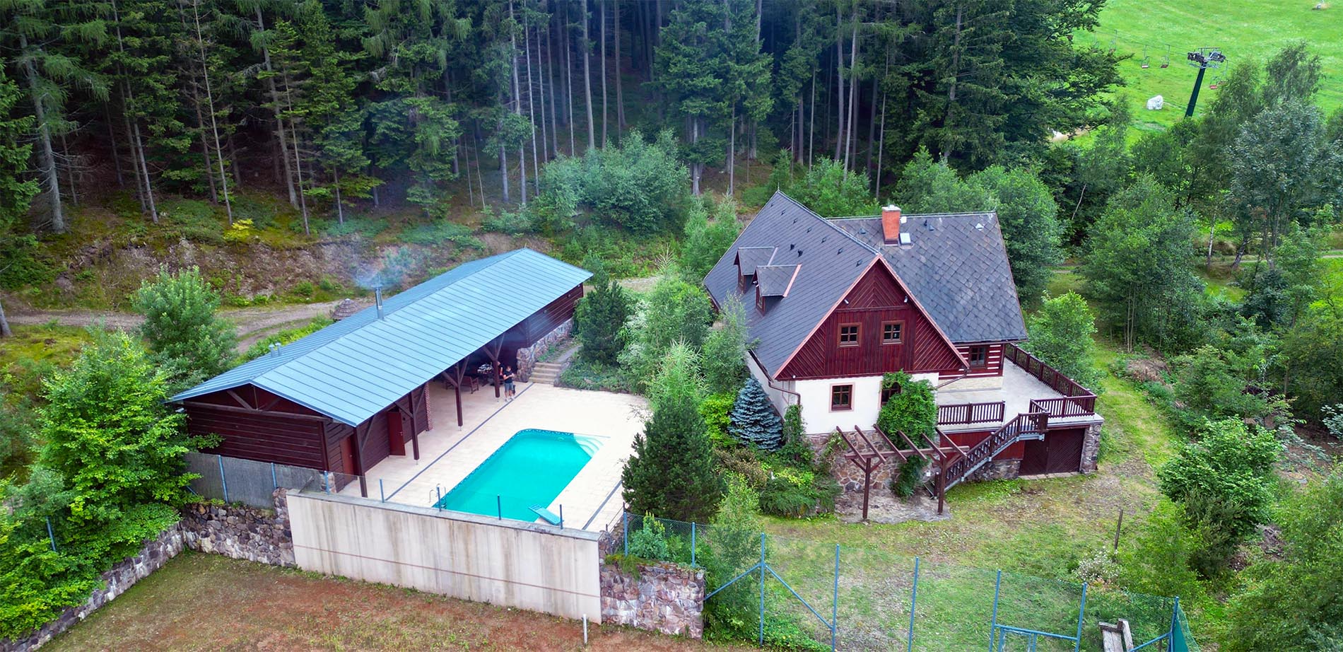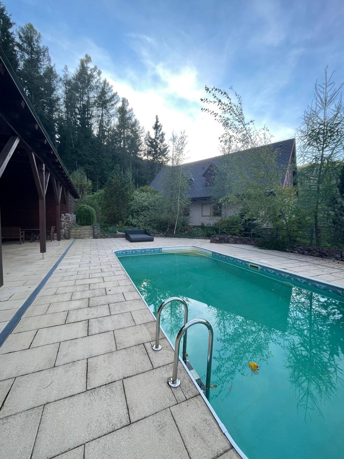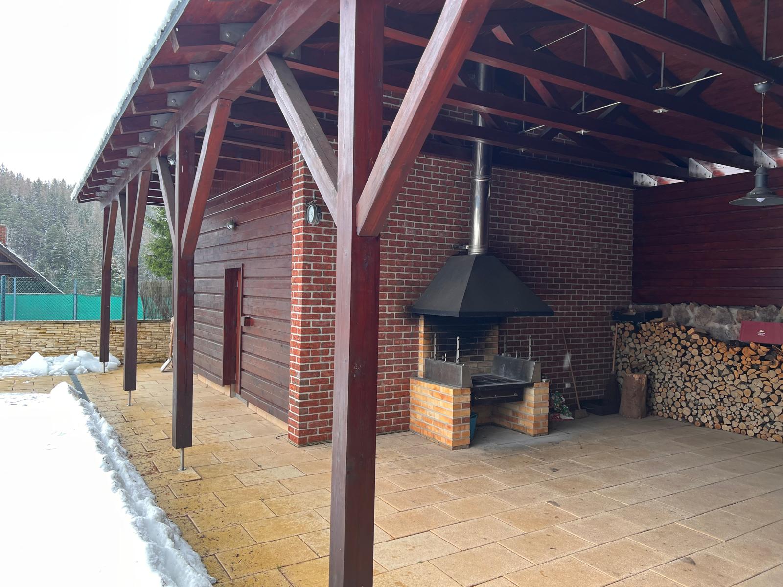 Exteriéry – majestátní horská příroda, venkovní posezení, zastřešený prostor pro grilování a oslavy, bazén, krásné okolí chaty